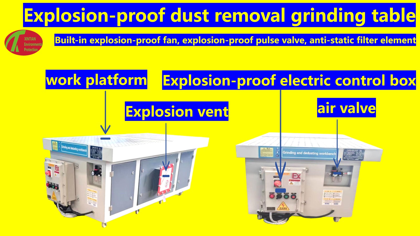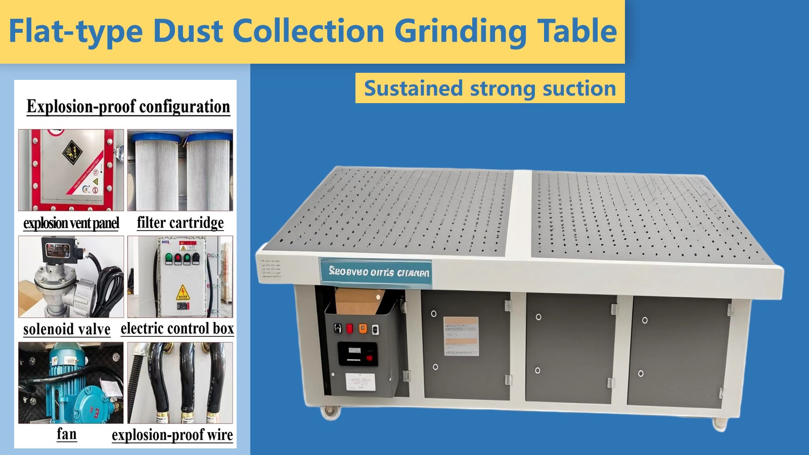 Mesra alam dan cekap: Meja pengamplasan penyerap habuk rata boleh mengeluarkan habuk pada sumber pengisaran, mengawal penyebaran habuk dengan berkesan, dan mengurangkan pencemaran habuk kepada alam sekitar dan membahayakan kesihatan pengendali.