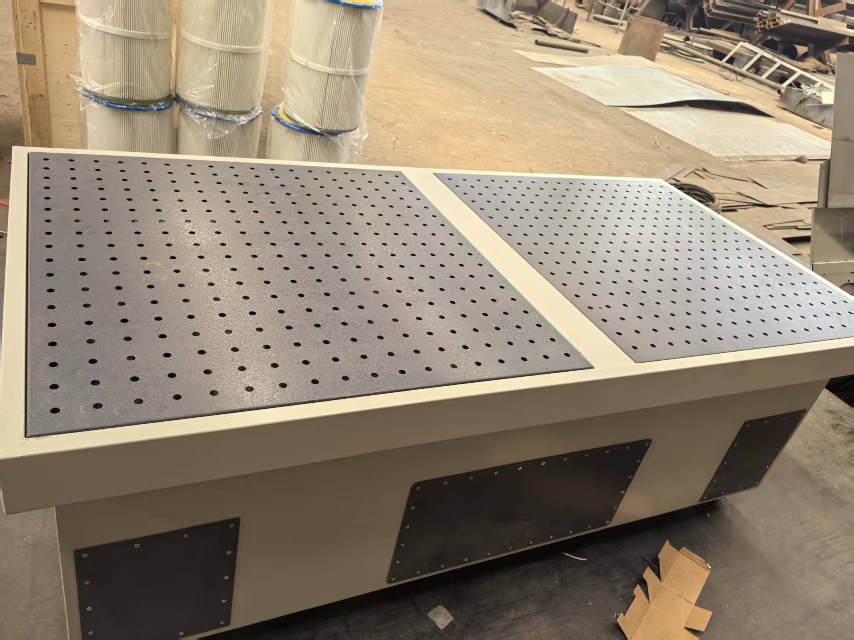- Mengurangkan risiko kebakaran:Debu plastik adalah bahan mudah terbakar dan letupan. Apabila ia mencapai kepekatan tertentu di udara, mudah menyebabkan letupan atau api ketika menghadapi sumber kebakaran. Jadual pengisaran penyingkiran habuk mengurangkan kepekatan habuk plastik di bengkel dengan penyingkiran debu yang tepat pada masanya, dengan itu mengurangkan risiko kemalangan keselamatan seperti kebakaran dan letupan, dan memastikan keselamatan pengeluaran perusahaan.Meja pengamplasan vakum rataMencapai kawalan ambang pengeluaran yang selamat terhadap bahan polimer dengan mewujudkan mekanisme keseimbangan dinamik untuk kepekatan habuk. Zarah-zarah plastik yang digantung mempunyai ciri-ciri titik kilat yang rendah disebabkan peningkatan kawasan permukaan tertentu, dan kecenderungan pembakaran diri mereka secara eksponen diperkuatkan dalam persekitaran yang bergolak. Serpihan nano-skala yang dihasilkan oleh proses pengisaran memasuki peranti pemisahan gas-padat melalui saliran tekanan negatif, supaya beban habuk di kawasan kerja selalu di bawah titik kritikal deflagasi.